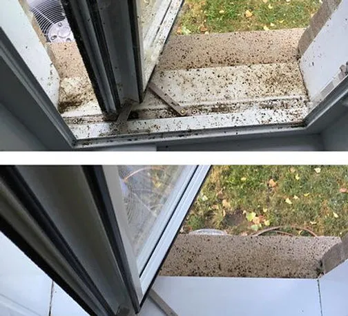 Pour nettoyer les rails des fenêtres, nous commençons par aspirer tous les gros débris ou saletés, puis nous appliquons notre solution pour nettoyer les coins et les endroits difficiles!